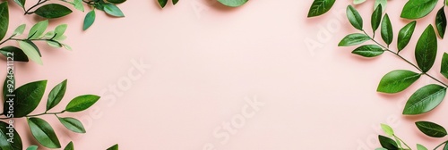 Naklejka premium Tranquil Pastel Green Foliage on Soft Pink Background, Serene and Elegant.,...