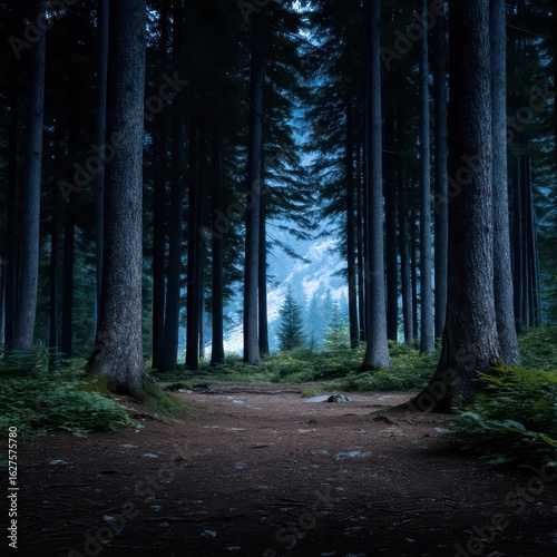 Fototapeta premium Tranquil Path Through Dark Forest Amidst Tall Trees