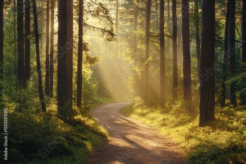 © Thanapong, Fototapeta premium Tranquil path winding through dense pine forest serene nature scene captivating light rays peaceful environment lush greenery natural beauty for relaxation and inspiration