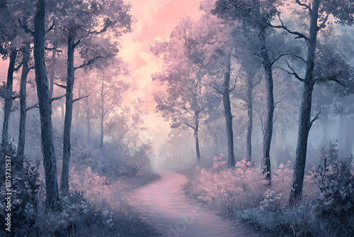 Obraz premium Tranquil Pathway through Enchanted Forest in Transcendent Pink Hues, Evoking...