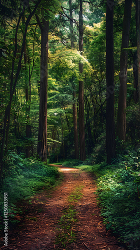 Naklejka premium Tranquil Pathways: A Peaceful Walk Through Serene Forest Trails Touched by Gentle Sunlight