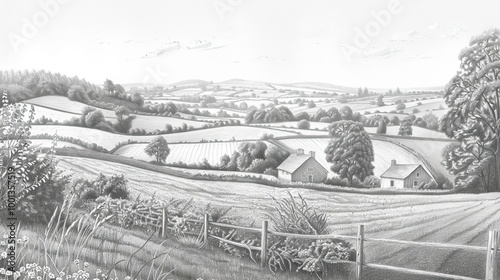 Fototapeta premium Tranquil pencil-drawn countryside scene with patchwork fields and rolling...