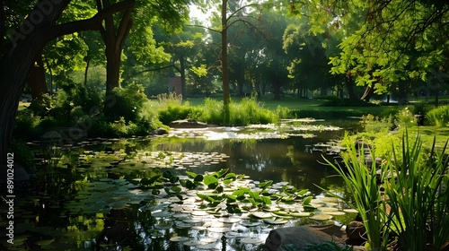 Naklejka premium Tranquil Pond in Lush Shady Park with Ducks and Lily Pads