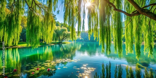 Fototapeta premium Tranquil Pond Surrounded by Lush Weeping Willow Trees, Sunrays Reflecting Off...