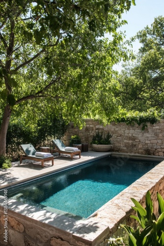 Obraz premium Tranquil poolside retreat with comfortable loungers surrounded by lush greenery in a private garden setting during a sunny day