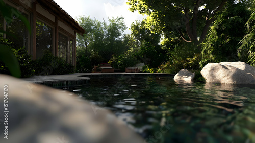 © Andri, Fototapeta premium Tranquil Poolside Setting With Wooden House And Lush Trees