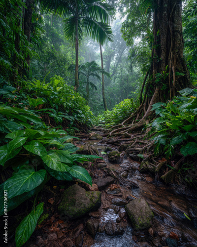 Fototapeta premium Tranquil rainforest creek flowing over wet stones and dark roots under lush...