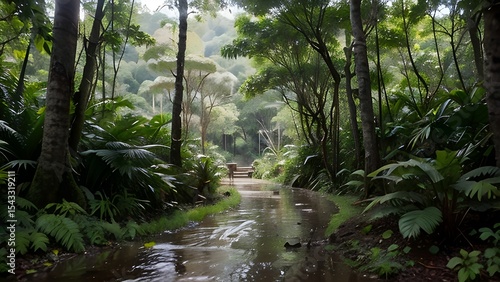 Obraz premium Tranquil rainforest stream with lush foliage and a distant bench