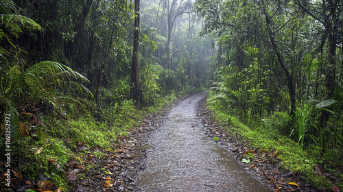Fototapeta premium tranquil rainy forest path with earthy trail surrounded by lush greenery