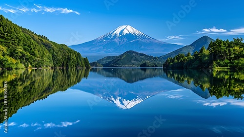 © Thavesak, Naklejka premium Tranquil Reflection of Mount Fuji in the Clear Waters of Lake Kawaguchi