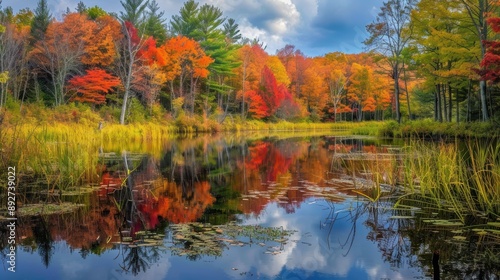 Fototapeta premium Tranquil Reflections: Autumn's Splendor Mirrored in a Serene Pond