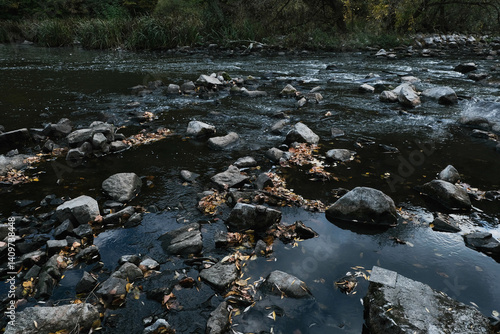 Obraz premium Tranquil Reflections on Water Featuring Beautiful Fall Leaves, Rocks, and...