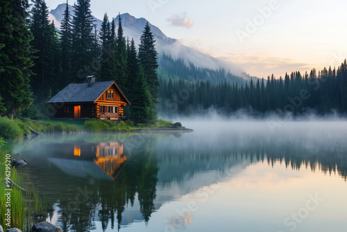 Fototapeta premium Tranquil Retreat: Mountain Cabin by the Lake at Sunrise