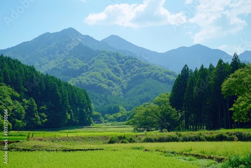 © Mykhailo Podolian, Obraz premium Tranquil rice fields beneath serene mountains on a bright sunny day in rural Japan