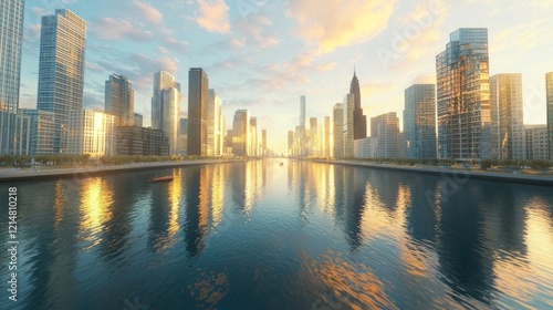 Fototapeta premium Tranquil River Cruise: Skyscraper Reflections on Water with Ultra-Detailed...