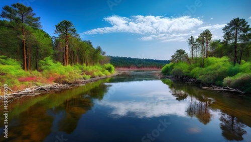 Fototapeta premium Tranquil River Flowing Through a Lush Forest Under a Bright Blue Sky, Featuring Scenic Landscape and Reflections of Trees and Clouds.