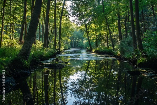 © atar, Fototapeta premium Tranquil River Flowing Through a Lush Green Forest