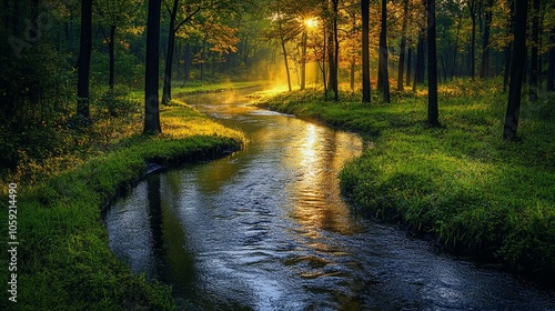 Obraz premium Tranquil River Flowing Through Forest with Sunlight Reflections
