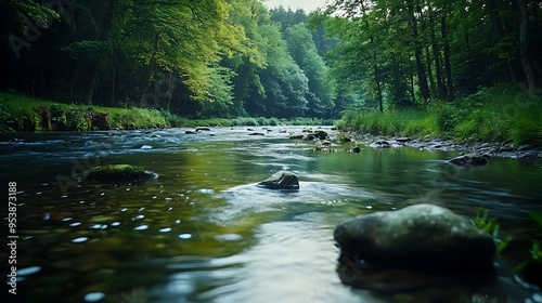 Naklejka premium Tranquil River Flowing Through Lush Forest Landscape with Rocks and Reflections