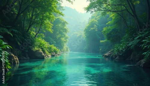 Naklejka premium Tranquil river flows through jungle. Emerald water reflects sky with green trees. Verdant plants grow along shore. Nature wallpaper illustrates serene ecosystem. Ecotourism promotion design. Travel