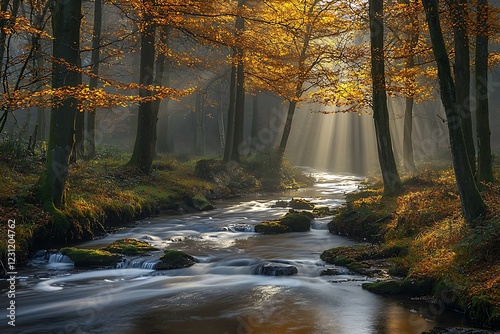 © Auon, Obraz premium Tranquil river meandering through a golden autumn forest with sunlight breaking through the canopy