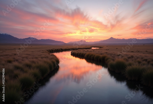 Fototapeta premium Tranquil River Meandering Through Golden Meadow During Magical Sunset Hour