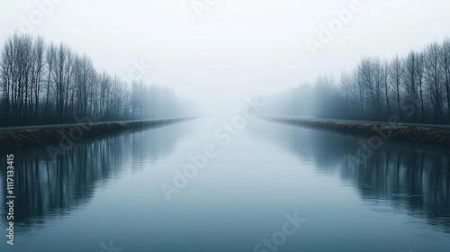 © Jiraporn, Fototapeta premium Tranquil river scene surrounded by fog and barren trees.