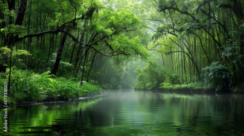 © wiwat apisithpinyo, Obraz premium Tranquil River Through Lush Green Forest.