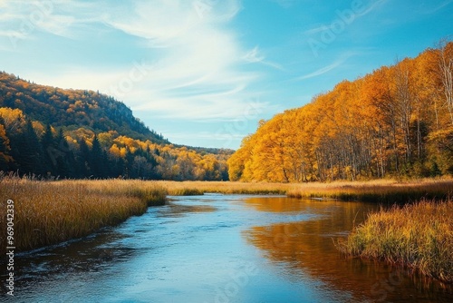 © tve-proneuro, Fototapeta premium Tranquil river winding through autumn valley surrounded by golden trees and blue sky, Ai Generation