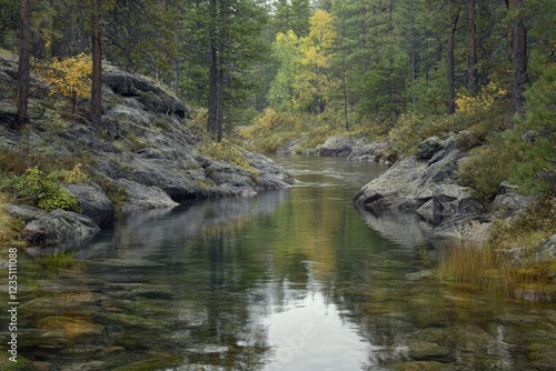 © YouraPechkin, Obraz premium Tranquil river winding through lush forest in autumn near rocky formations