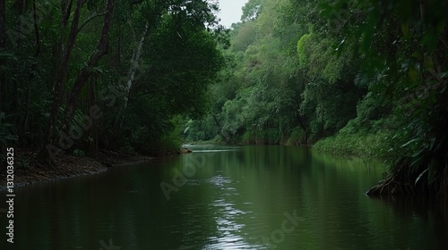Fototapeta premium Tranquil Riverine Scene: A serene river flows through a dense, verdant jungle, the lush green vegetation reflected in its calm waters, creating a sense of peace and immersion.