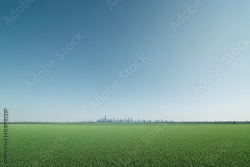 © Maria, Fototapeta premium tranquil rural landscape with green fields juxtaposed against distant urban skyline under clear blue sky showcasing