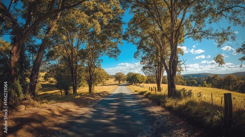 Fototapeta premium Tranquil rural road with trees casting shadows on a sunny day