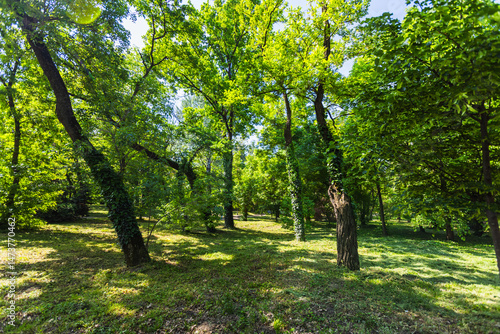 Fototapeta premium Tranquil scene in a forest or park with sunlight filtering through the lush...