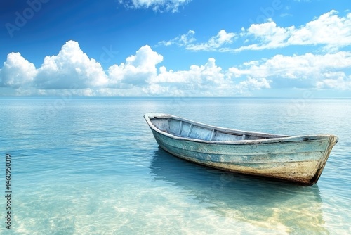 Naklejka premium Tranquil scene of a small boat on a placid sea under a vast azure sky