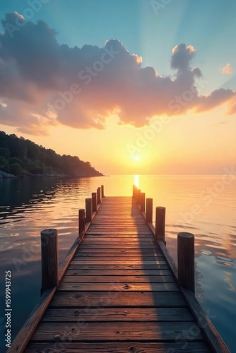 Fototapeta premium Tranquil scene of a wooden dock extending into calm waters, bathed in the...