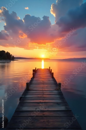 © Pawina, Fototapeta premium Tranquil scene of a wooden dock extending into calm waters, meeting a serene shoreline at sunset Perfect for travel, nature, or relaxation themes , clouds, bay, tranquil