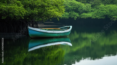 © Fauzerene, Fototapeta premium Tranquil Scene of Greenery with a Boat in a Calm Mangrove Area