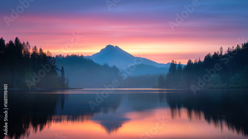 © Blue Berry Craft, Obraz premium Tranquil scenic lake landscape at sunset with silhouetted mountains and forest reflections