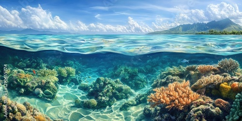Fototapeta premium Tranquil seascape featuring vibrant coral reef with turquoise water and...
