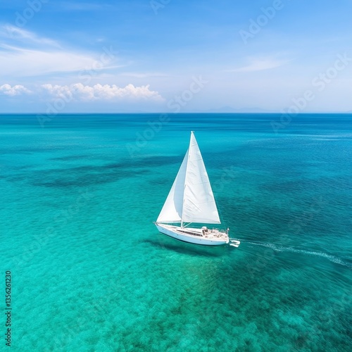 © Fluke, Obraz premium Tranquil Seascape with a Single Sailboat on Clear Blue Water