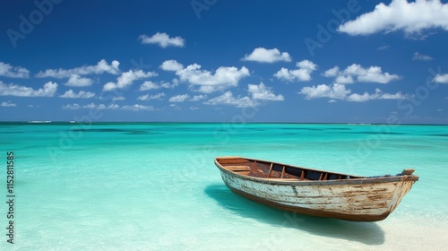 © Sampao, Naklejka premium Tranquil Seascape with a Wooden Boat Under a Blue Sky