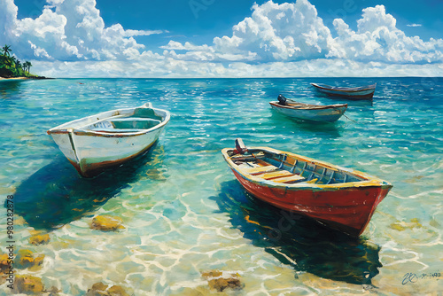 © Noufaldi, Naklejka premium Tranquil seascape with boats on clear water under a bright sky.