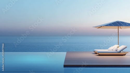 © khonkangrua, Fototapeta premium Tranquil Seascape with Poolside Lounger and Umbrella at Sunset Over Calm Blue Ocean Waters