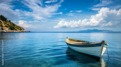 Naklejka premium Tranquil Seascape with Small Boat. Concept of peace, serenity, and escape.