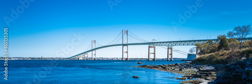 © Naya Na, Naklejka premium Tranquil seascape with the view of Claiborne Pell Newport Bridge on Route 138 in Rhode Island. Smooth water flows under the bridge, long exposure photography.