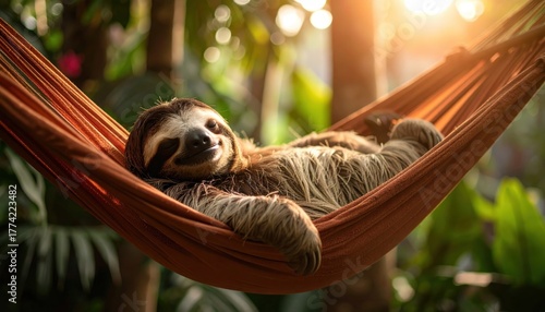 © meka, Naklejka premium Tranquil sloth slumbering peacefully in a hammock amid lush green foliage