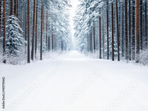 © pitchanat, Naklejka premium Tranquil Snowy Road Winding Through Lush Green Forest Surrounded by Majestic Pine Trees Under a Clear Blue Sky Eliciting a Sense of Calm and Adventure