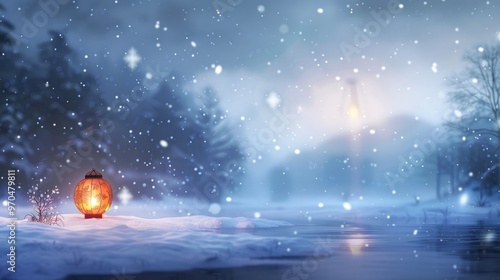 Fototapeta premium Tranquil Snowy Scene with a Single New Year's Lantern