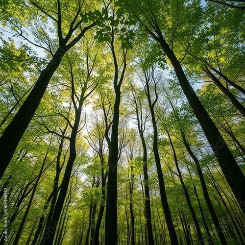 Obraz premium Tranquil Spring Forest with River and Towering Beech Trees